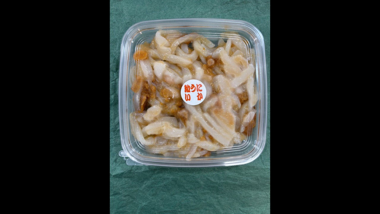 うにの粒々を贅沢に使用して、もっちりとしたいかと和えて仕上げたうに和えものです。ご飯にもお酒にもとても合う一品です。